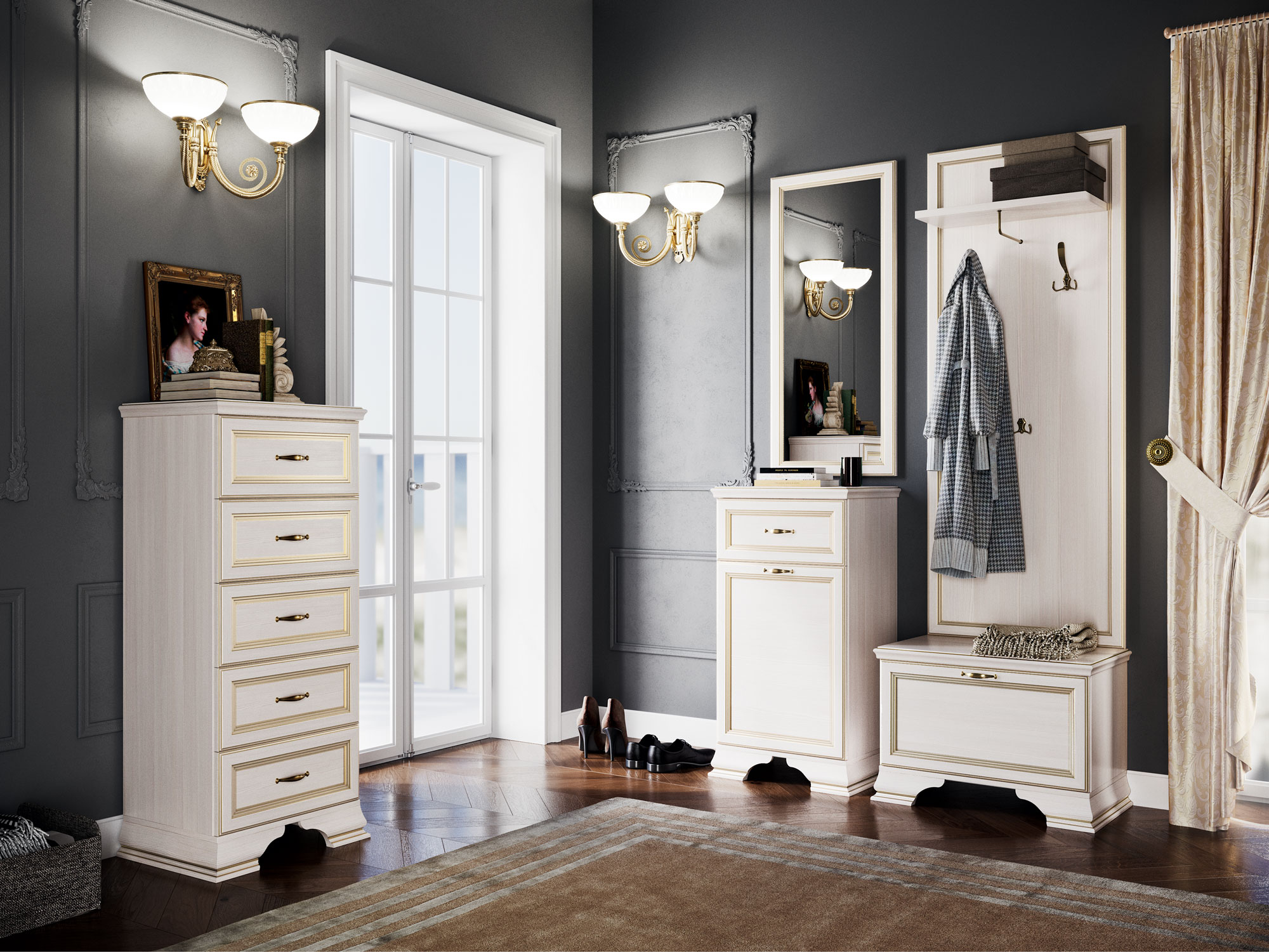 Коллекция производится в текстуре «бодега белый» с эффектом золотого патинирования.